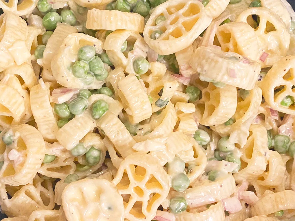 Alliterative Creamy Ceasar Pea Pasta Shallot Salad