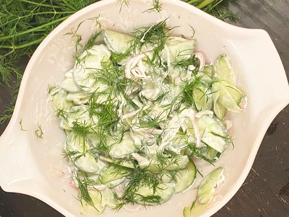 Half a cucumber, leftover sour cream, an old shallot, and a lemon close to its end of life make up this vibrant salad