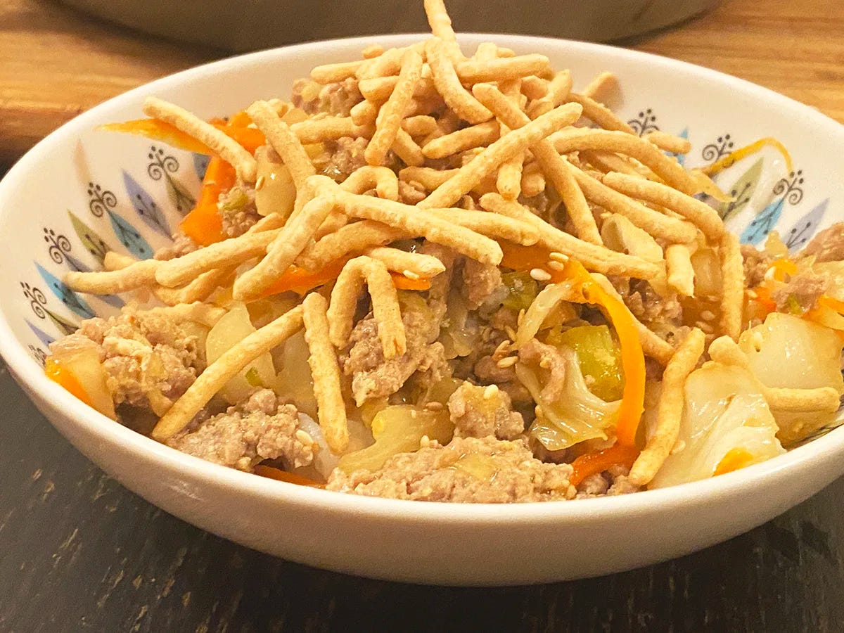 At first, I thought this dish was going to be something of a salad. I pictured it as a crunchy, refreshing slaw with cooked porked, and so I decided to top it with crunchy Chow Mein Noodles. These crunchy noodles would become the substitute for the wrapper.