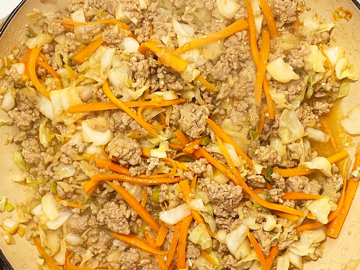 I decided to shift from an egg roll salad to an egg roll stir fry. I was going to have to cook the ground pork anyway, and so cooking the vegetables a bit with all that seemed like the better way to have the flavors mesh well. Then I asked my wife if we should make rice to go with it – and that’s when I realized I was actually making an Egg Roll Bowl.