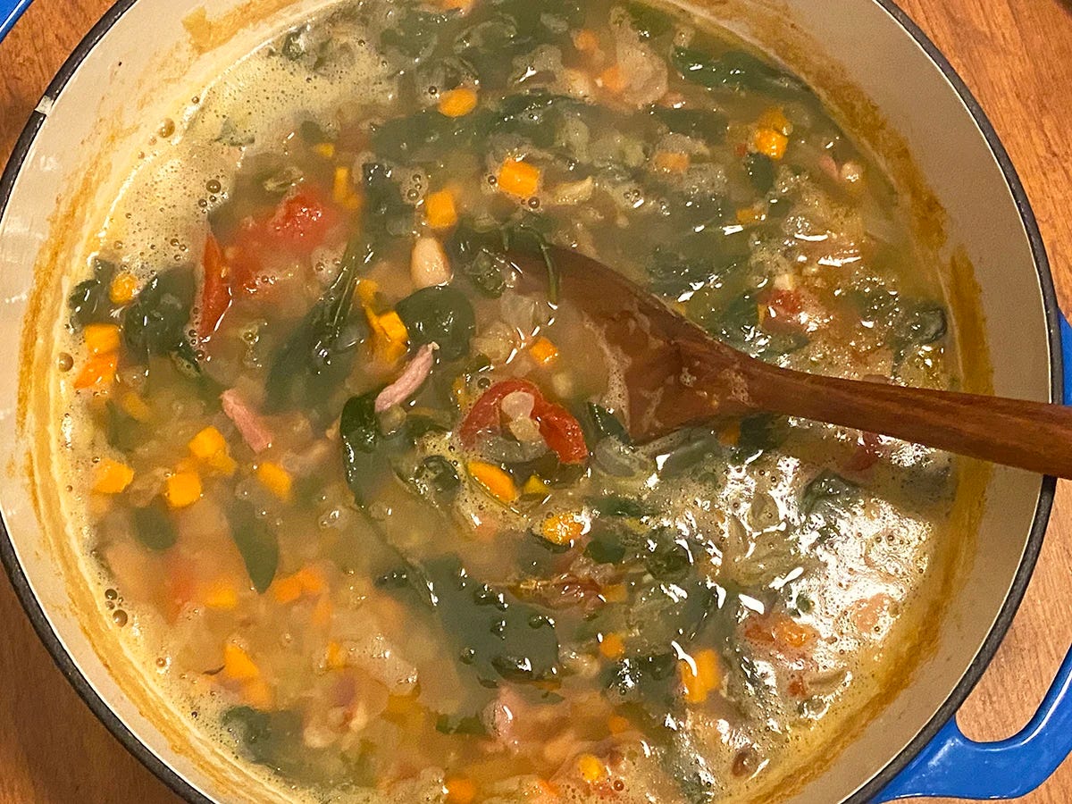 The most recent bean club box had arrived from Rancho Gordo, and we pulled out a bag of yellow-eyed beans. My Google search pulled up this Ham and Bean Soup recipe from The Kitchn. I liked the way the photo looked and decided to cook up a soup that resembled that.