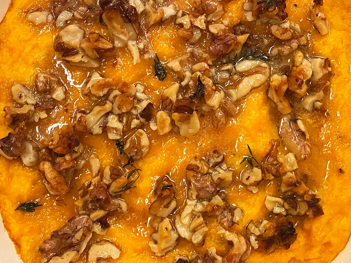 I love a good sweet potato mash. I especially enjoy it alongside a squash puree and mashed white potatoes—three squishy starches in shades of yellow and orange? What’s not to love.