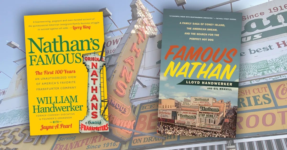 Believe it or not, there are actually two books about the history of Nathan’s, both co-written by grandsons of the Handwerker family. Lloyd Handwerker’s memoir Famous Nathan and Wiliam Handwerker’s cultural history, Nathan’s Famous, offer two perspectives on the rise and fall and rise again of the restaurant, the offshoots, franchises, and grocery store hot dogs.