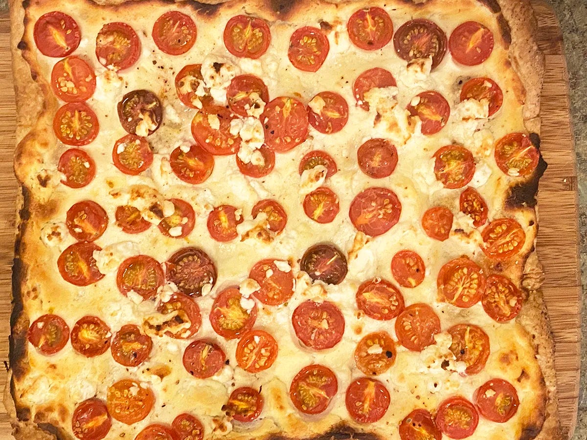 My wife rolled out this first tomato tart, smeared on some sour cream and then arranged a colorful selection of tomatoes along with chunks of goat cheese.