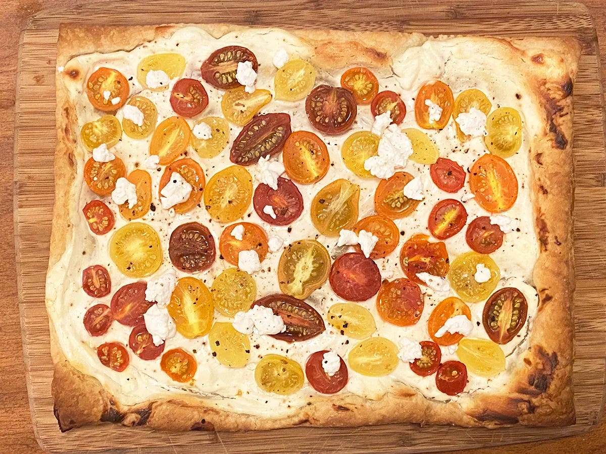 Cookbook author Melissa Clark’s Dinner In French has a prominent place on our cookbook shelf. The cover photo of the book features a puff pastry tart topped with crème fraiche, goat cheese, and asparagus. We’ve made it before, and it inspired us. to make one with tomato.