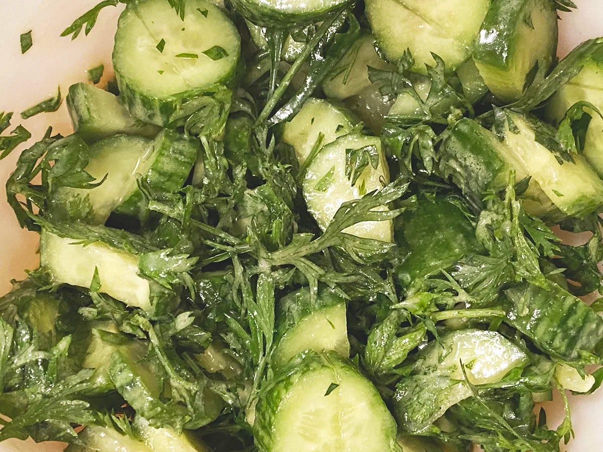 Mustardy Cucumber and Carrot Top Salad